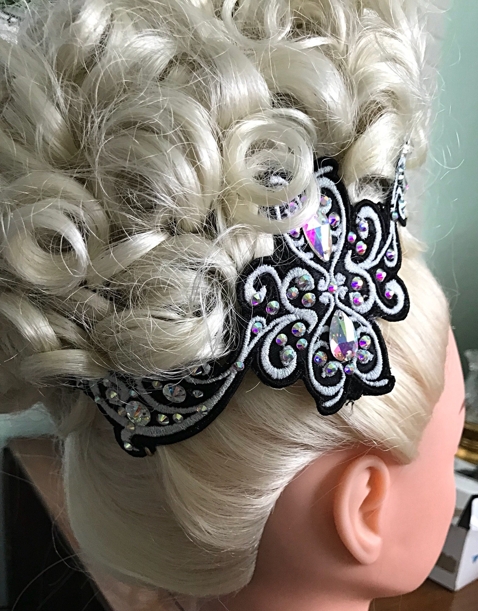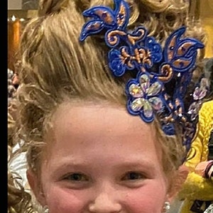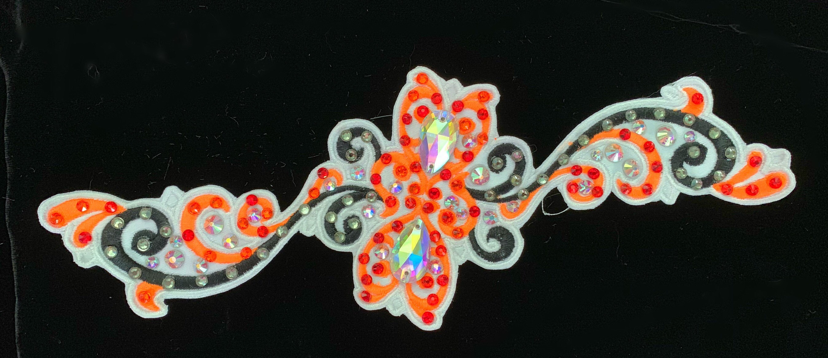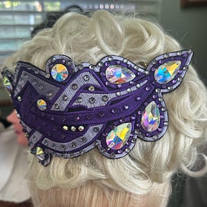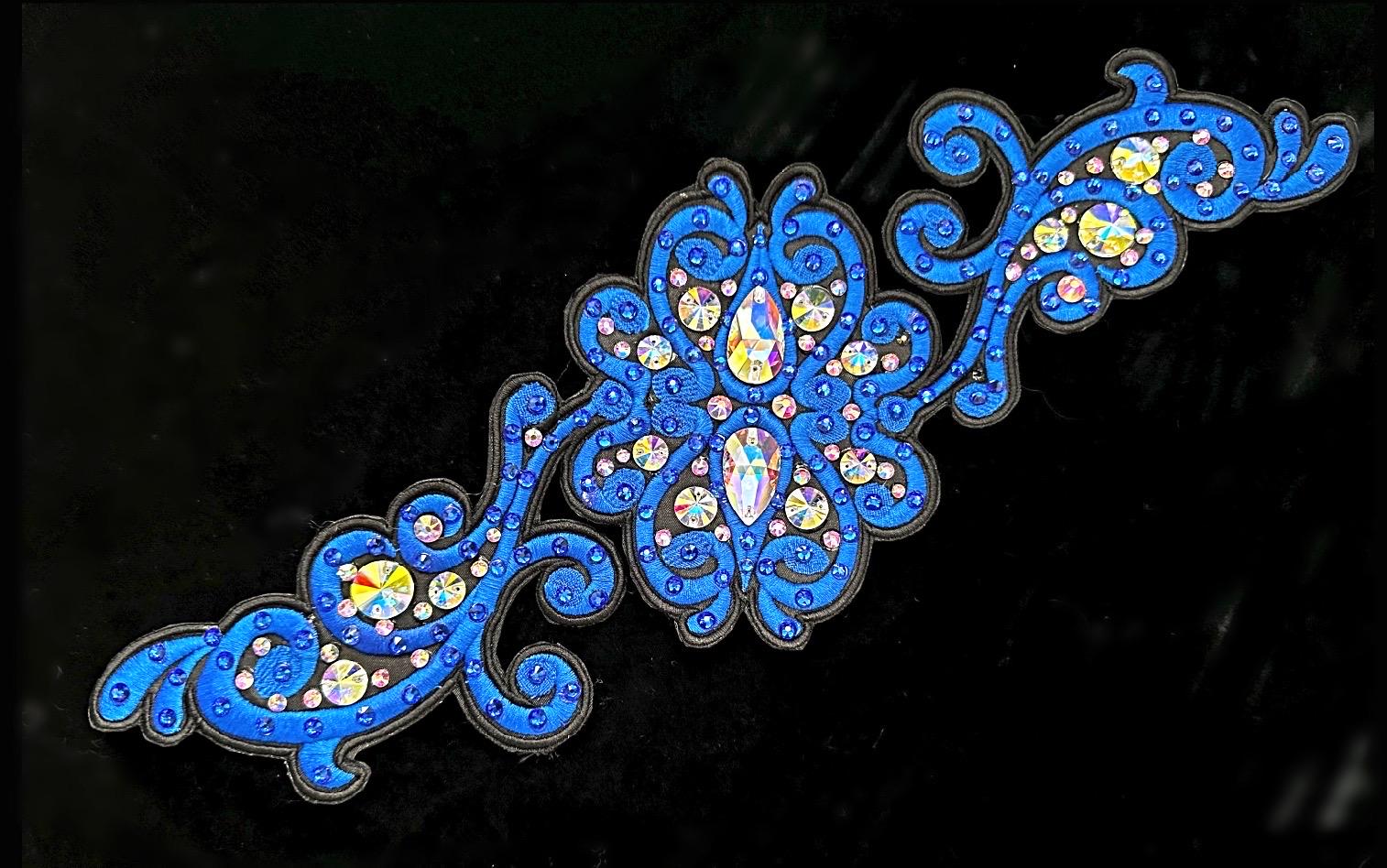 Side Tiaras are what’s in style now. This embroidered side Tiara has endless possibilities with colors and stones. Pick and choose from the thread and fabric colors and stones to create a beautiful hair accent to coordinate with your costume. They can be worn under a bun wig or on the side of the head to add additional color and bling. These are attached via alligator clips